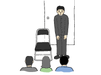 入室して礼をしたら、気を付けの姿勢で自己紹介。また例をします。その後、面接官の前の椅子の横まで静かに歩き、気を付けの姿勢を取ります。